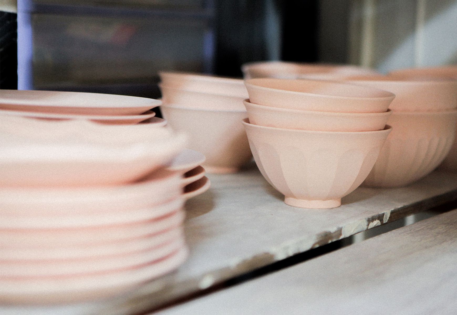 独特の緑色の青磁、染付、赤絵などの作品を当時の技法を使って製作しています。